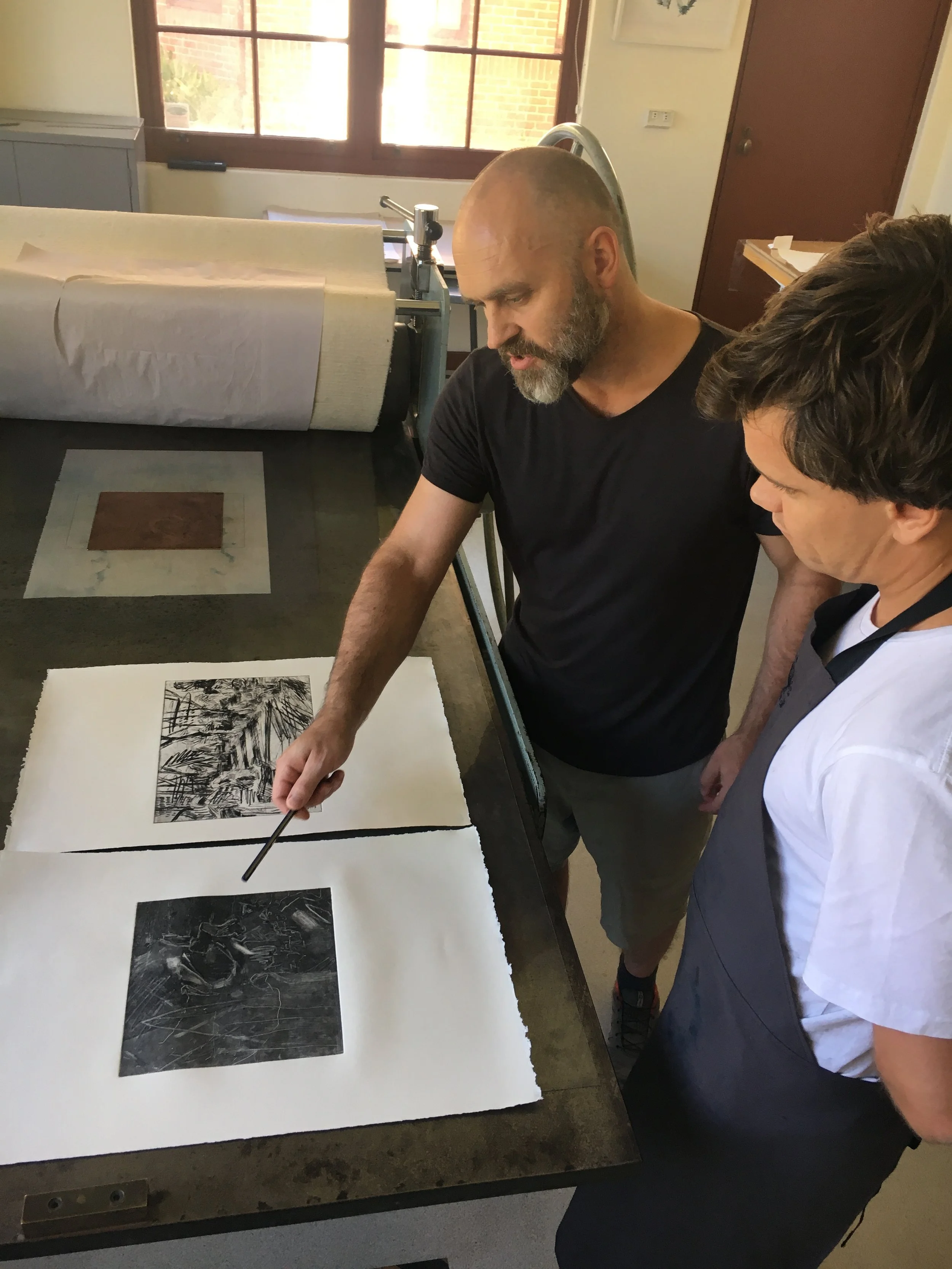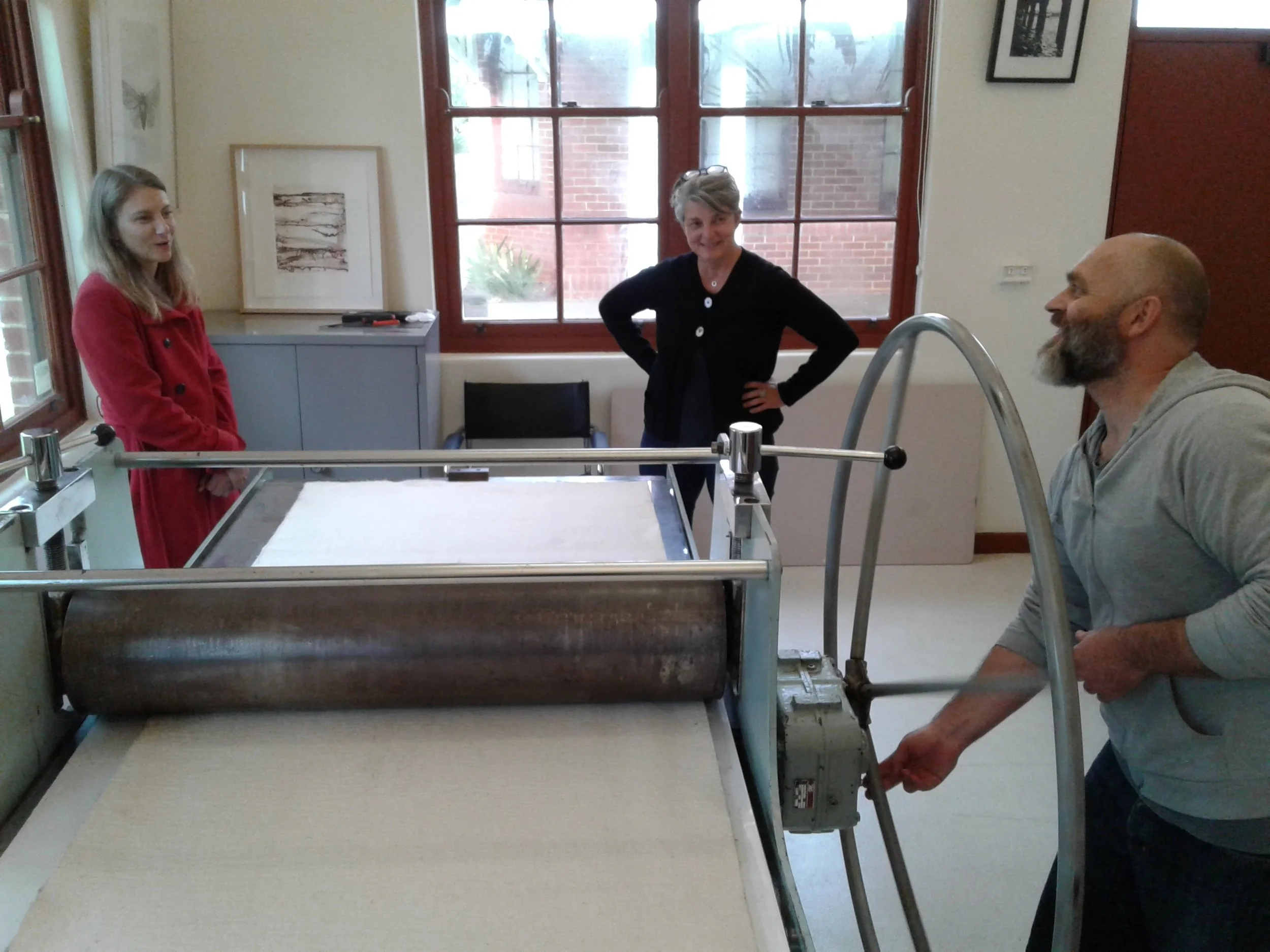 Jana Braddock offered studio space at Melville Cultural Precinct (previously known as Heathcote) to house a 1950’s Melbourne Etching Press purchased by Jo Darvall’s husband Pip, from Newman TAFE. Harvey Mullen, Shane Mullins and Pip Darvall installed the press.